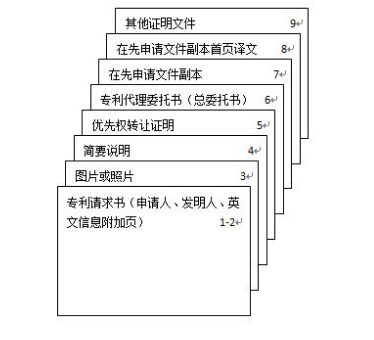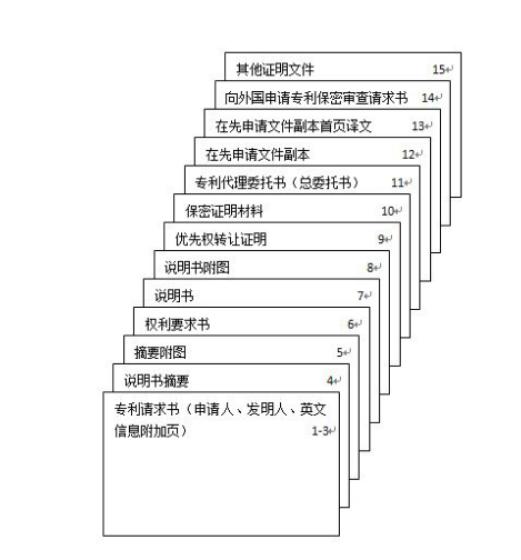 1.申请文件应当包括:《发明专利请求书》、《说明书摘要》(必要时应当提交《摘要附图》)、《权利要求书》、《说明书》(必要时应当提交《说明书附图》),各一式一份。